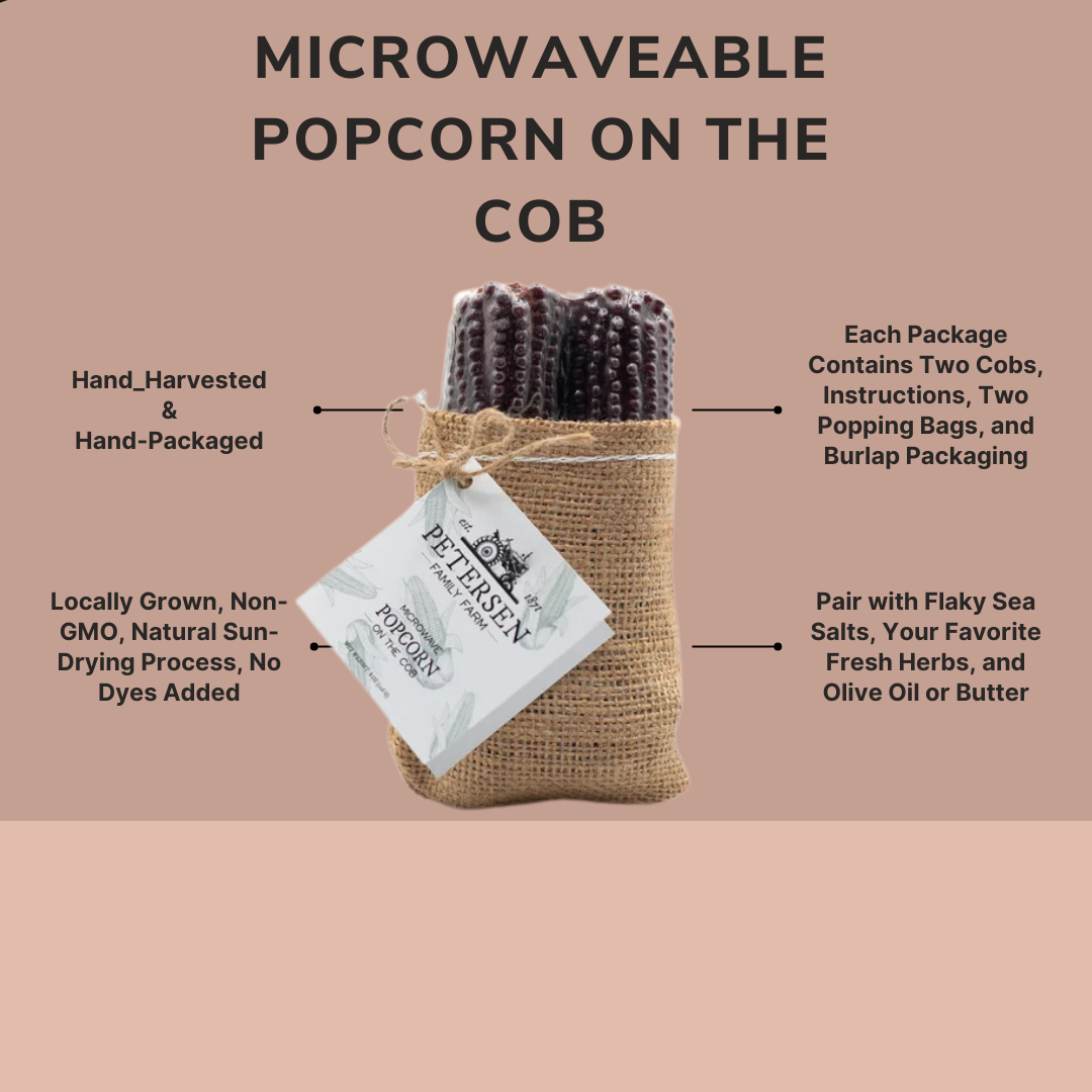 Pop into a delightful snacking adventure with our Microwave Popcorn on the Cob & Burlap! Each set includes two hand-harvested popcorn cobs, nestled in rustic burlap, adding a touch of farm-fresh joy to your gourmet offerings. Grown in Utah, these cobs embody the Petersen Family Farm tradition, elevating your popcorn experience!
